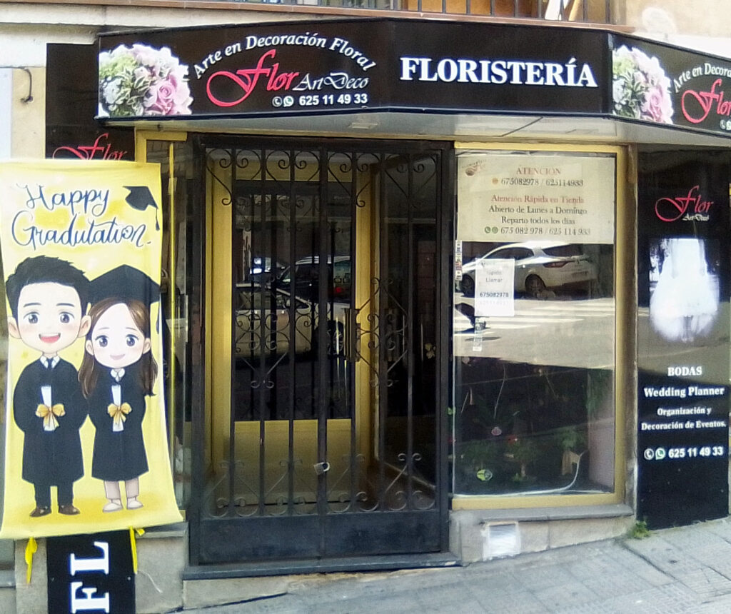 Otro ejemplo de boberías en inglés. Esta vez se trata de una tienda que tiene una macedonia de inglés-español-francés que es para nota. Lo que más llama la atención es el desplegable (roll-up le dicen) anunciando flores para las graduaciones. Eso sí, en inglés, que será como lo han encontrado y fusilado de la red. ¿Para qué andar rehaciendo el cartel? Hala, tal y como lo encontré, lo pongo.